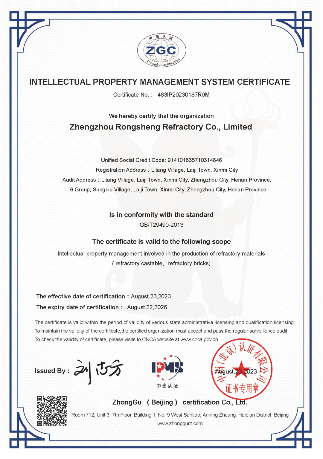 喜訊!榮盛耐材通過國家「知識產權管理體系認證」!